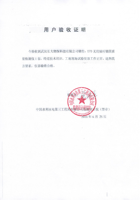 新聞網訊(通訊員:陳華) 熱烈祝賀我公司EFD無線錨桿錨固質量檢測儀順利中標中國水利水電第三工程局有限公司勘測設計院瑪爾擋水電站招標項目。