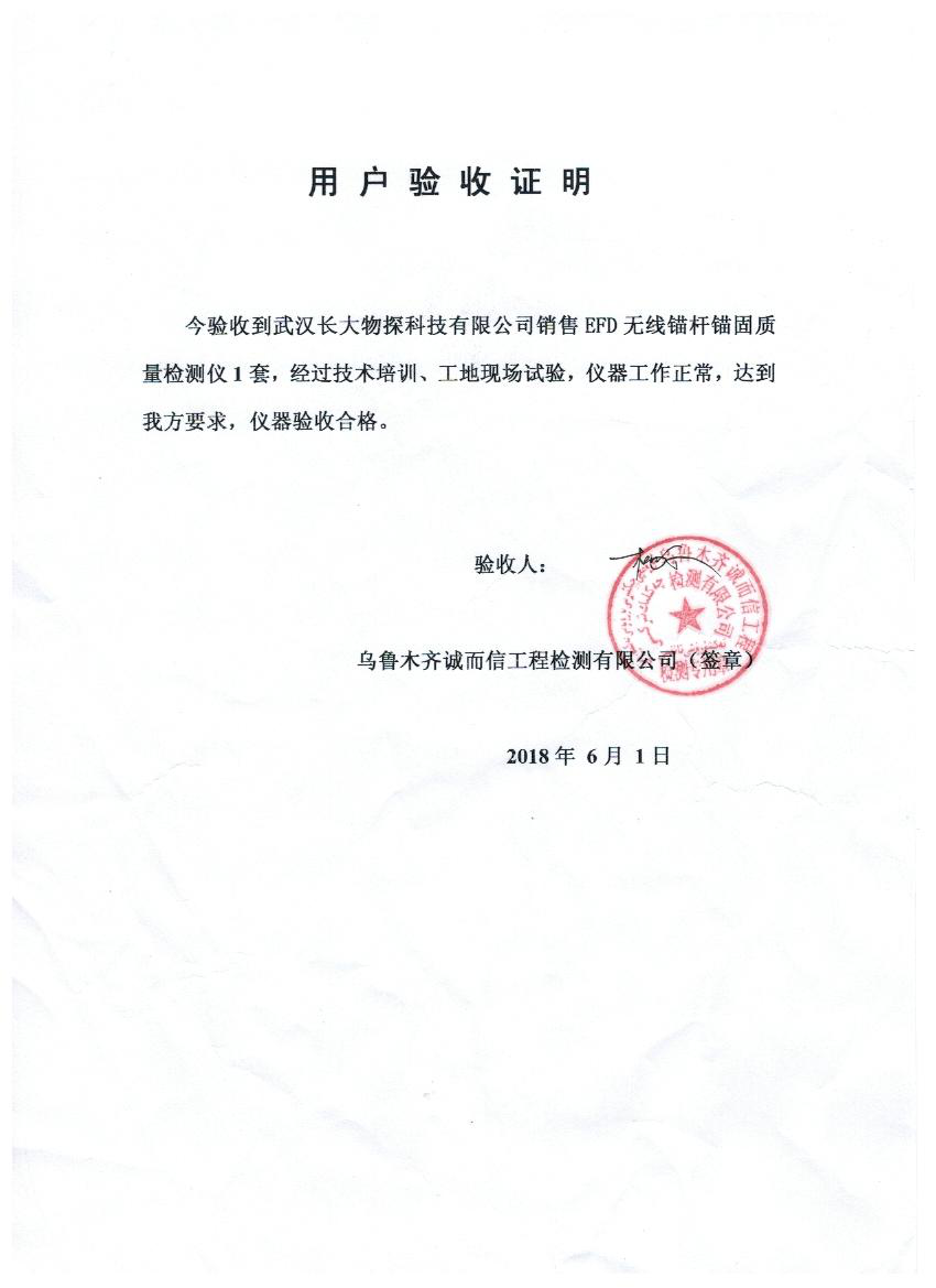 新聞網(wǎng)訊(通訊員:于東) 熱烈祝賀:烏魯木齊誠而信工程檢測有限公司經(jīng)過招標(biāo),順利采購我們公司EFD無線錨桿錨固質(zhì)量檢測儀一套。