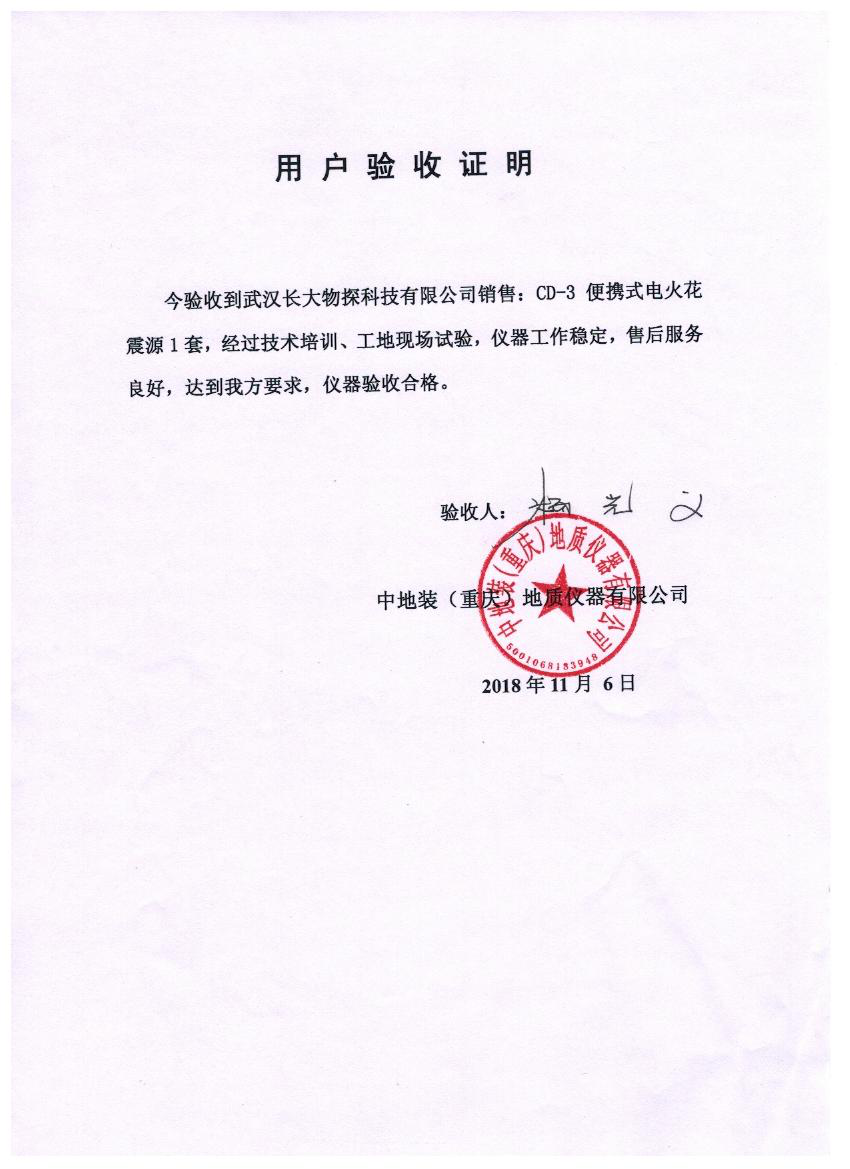 文章來源:武漢長大物探科技有限公司 發(fā)布日期:2018/11/6 瀏覽次數(shù): 次新聞網(wǎng)訊(通訊員:于東) 2018年11月4日—6日,我公司聯(lián)合中地裝(重慶)地質(zhì)儀器有限公司中標(biāo)CD-3便攜式電火花震源,給第三方重慶市地質(zhì)礦產(chǎn)測試中心打包供貨。經(jīng)過業(yè)主單位工地現(xiàn)場試驗,儀器工作穩(wěn)定,驗收合格,我公司儀器獲得了一致認(rèn)可和肯定。