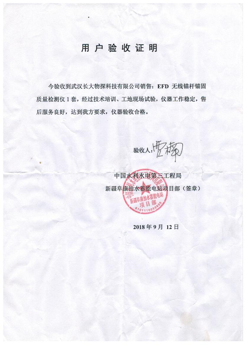 新聞網訊(通訊員:于東) 熱烈祝賀:中國水利水電第三工程局有限公司(新疆阜康抽水蓄能電站項目部),購買我公司EFD無線錨桿錨固質量檢測儀一套。