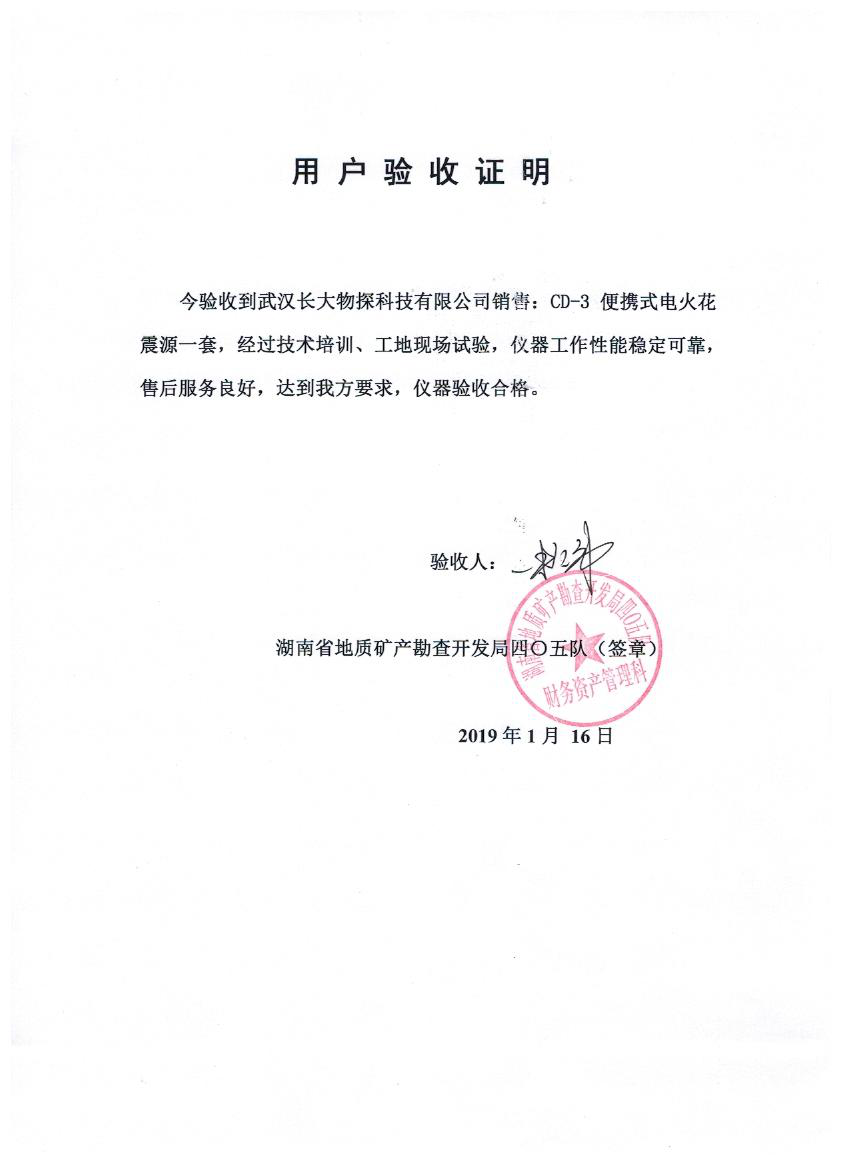 文章來(lái)源:武漢長(zhǎng)大物探科技有限公司 發(fā)布日期:2019/1/16 瀏覽次數(shù): 次新聞網(wǎng)訊(通訊員:于東) 2018年12月20日,湖南省地質(zhì)礦產(chǎn)勘查開(kāi)發(fā)局通過(guò)財(cái)政招標(biāo),采購(gòu)我公司CD-3便攜式電火花震源一套,經(jīng)過(guò)技術(shù)培訓(xùn),工地現(xiàn)場(chǎng)試驗(yàn),儀器工作性能穩(wěn)定可靠,售后服務(wù)良好,儀器得到業(yè)主單位的一致好評(píng)和肯定。